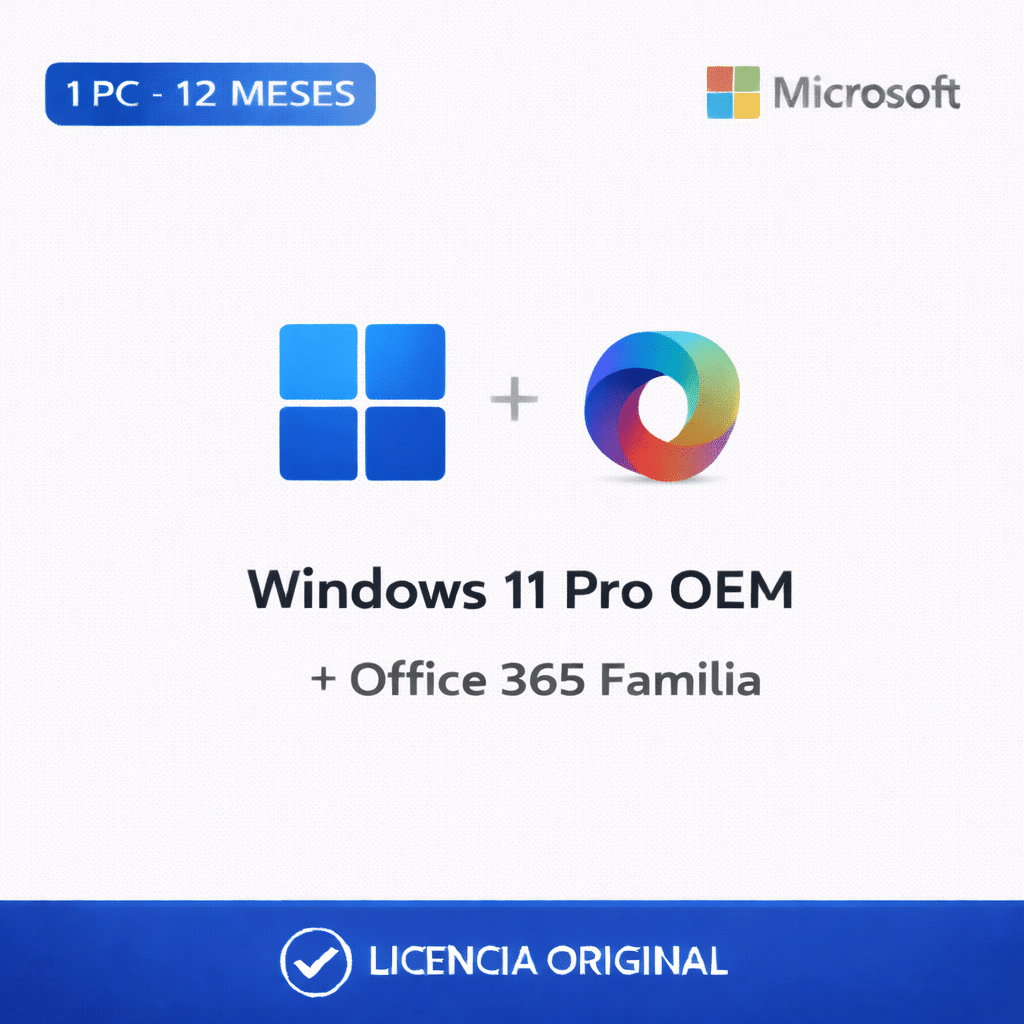 Combo Windows 11 Pro OEM + Office 365 Familia — 12 Meses — 2 Licencias – 1 PC (Licencia digital)