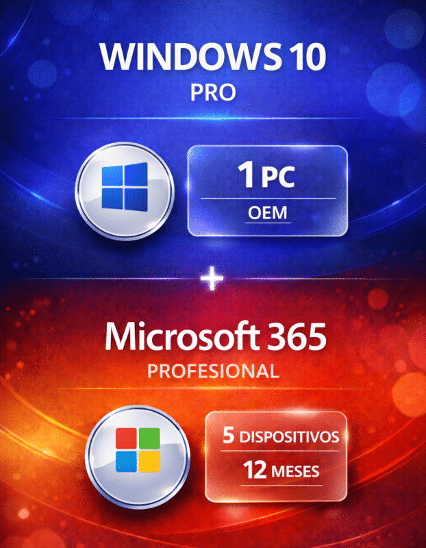 Combo Windows 10 Pro OEM + Microsoft 365 Profesional — 12 Meses — 1 Cuenta Nueva + 1 PC (Licencia digital)