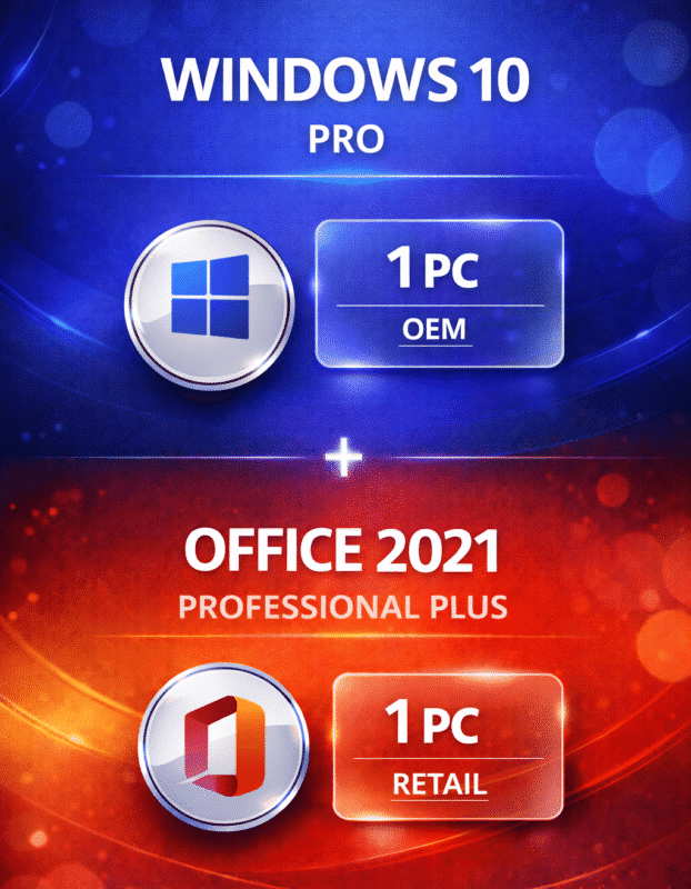 Combo Windows 10 Pro OEM + Office 2021 Pro Plus Retail — 1 PC — 2 Licencias (Licencia digital)