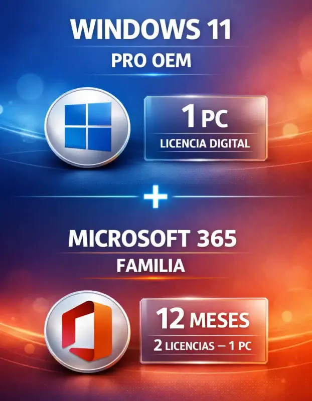 Combo Windows 11 Pro OEM + Office 365 Familia — 12 Meses — 2 Licencias – 1 PC (Licencia digital)