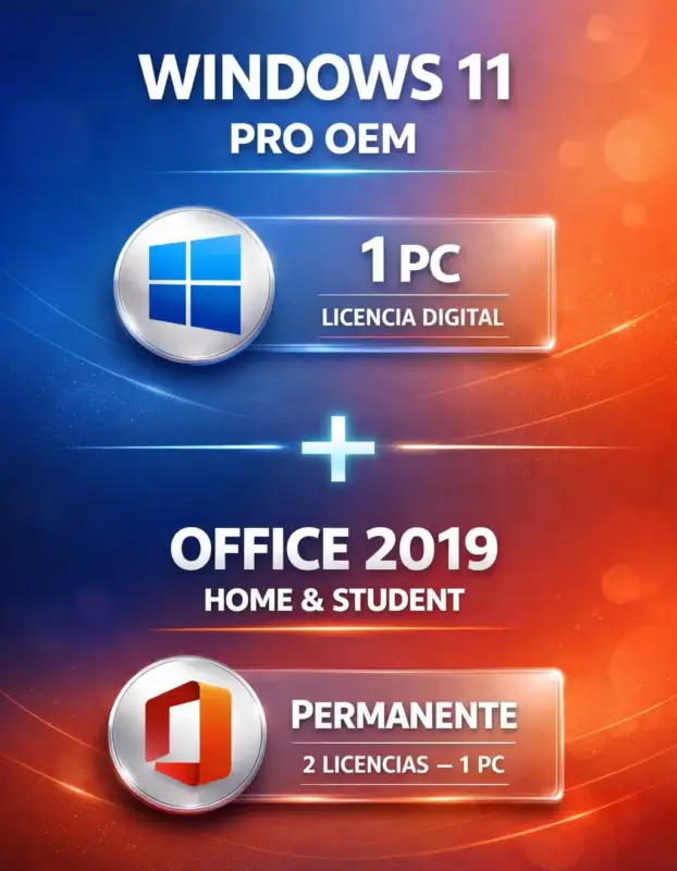 Combo Windows 11 Pro OEM + Office 2019 Home & Student — Permanente — 1 PC — 2 Licencias (Licencia digital)
