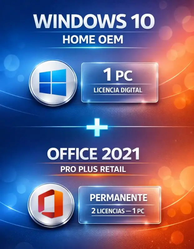 Combo Windows 10 Home OEM + Office 2021 Pro Plus Retail — Permanente — 1 PC — 2 Licencias (Licencia digital)